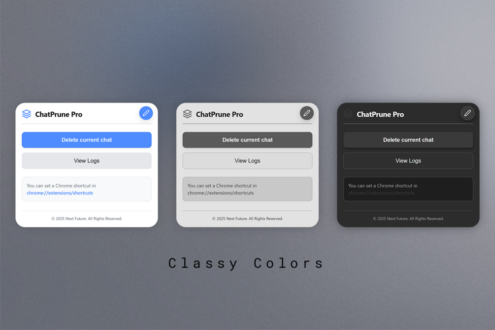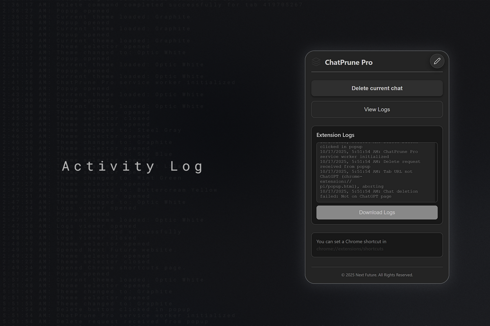 Manage and delete ChatGPT chats instantly. Premium edition adds shortcuts, themes, logs, and a polished interface by Next Future.